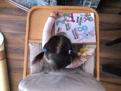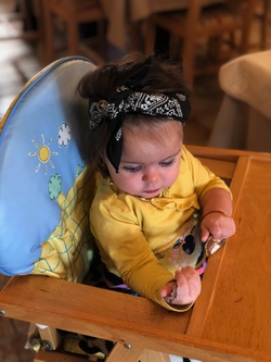 Am aplicat o metodă mixtă, în sensul că o hrăneam și eu, dar o lăsam și pe ea să descopere hrana, textura mâncării. Totul a fost la început pentru ea ca o joacă. Îi puneam pelerina și apoi o lăsam să se joace cu linguriță în farfurie. Am stat cu ochii pe ea, nu am riscat, dar în același timp am vrut să-i dau senzația că acela e un moment când ne jucăm.