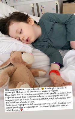 „Offf imaginea asta mă rupe în bucăți... Stau lânga el cu ochii în lacrimi și îi mulțumesc lui Dumnezeu că azi ne-a vegheat... După multe luni de chin și nesomn, astăzi le-am spus Bye polipilor.”, a scris ea pe Instagram.