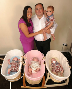 Însă surpriza cea mai mare a venit în momentul în care femeia a efectuat prima ecografie. Medicul i-a dezvăluit că va deveni mămică de… tripleți. Atent monitorizată în timpul cele de-a doua sarcini, Sarah a născut prematur 9 luni mai târziu după ce a devenit pentru prima dată mămică. Tripleții, doi băieți și o fetiță, au primit numele Stanley, Reggie și Daisy. Au recuperat foarte repede și, după externare, părinții lor au început marea aventură: cei doi schimbau cam 175 de scutece pe săptămână și preparau câte 80 de sticle de lapte, iar mașina de spălat funcționa continuu.