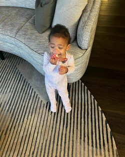 În prima imagine, fetița a fost surprinsă de scăunelul de masă, uitându-se cu ochișiorii mari și negri la cameră. În următoarea fotografie, pare extrem de prețioasă stând pe canapea în pijamaua ei cu flori și jucându-se cu părul ei creț, iar în următoarele două a fost surpinsă în ipostaze de joacă, prin casă.