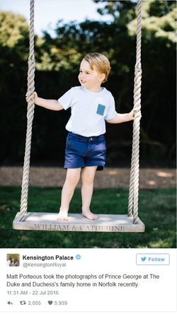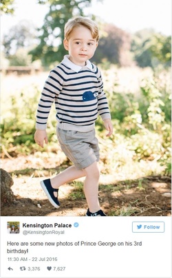 Prinţul George Alexander Louis s-a născut pe 22 iulie 2013, iar pentru a marca împlinirea a trei ani, familia regală a dat publicităţii patru imagini inedite cu micuţul, care au fost postate pe mai multe rețele de socializare: Instagram, Twitter și Facebook.