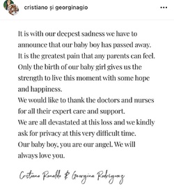 Cristiano Ronaldo și Georgina Rodriguez trăiesc o adevărată dramă, după ce unul dintre gemenii lor a murit la naștere. Georgina era însărcinată cu gemeni, fată și băiat, însă băiețelul a murit la naștere.