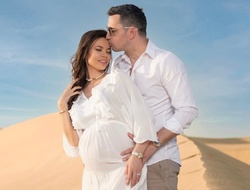 Viitorii părinți s-au filmat într-un desert, într-un cadru extrem de romantic. Denisa apare într-o salopetă mulată, în care i se vede burtica de graviduță.