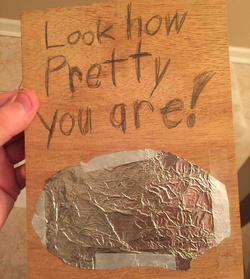 Când aveam 8 ani, i-am dăruit mamei o bucată de lemn, pe care am scris: 'Uite cât ești de frumoasă, mami". În loc de oglindă am lipit o bucată de staniol.