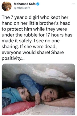 „Fetița de 7 ani și-a ținut mâna pe capul fratelui ei pentru a-l proteja, în timp ce au stat 17 ore sub dărâmături. Văd că nimeni nu împărtășește. Dacă ar fi fost moartă, toată lumea ar împărtăși. Împărtășește pozitivitate...”